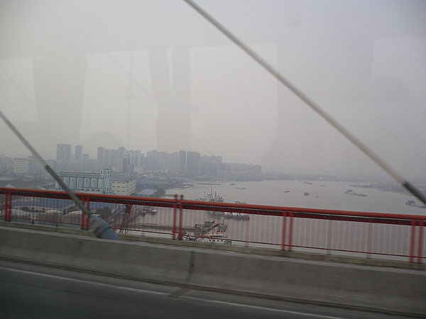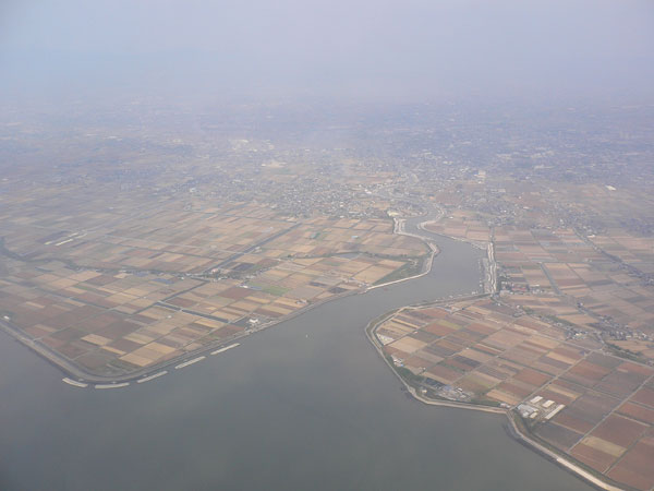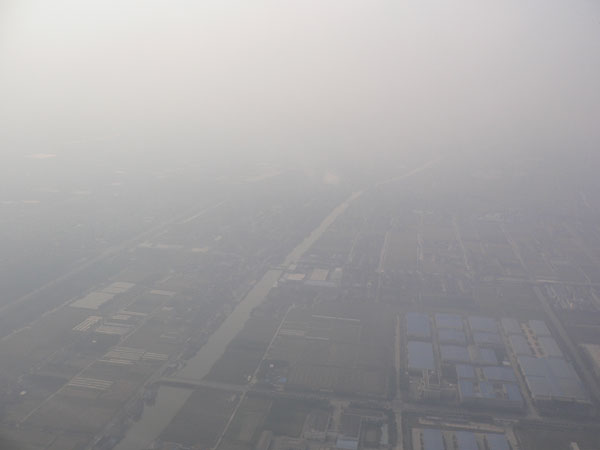 次の写真は上海上空、佐賀よりさらに霞んでます。さらに少し黄色い。