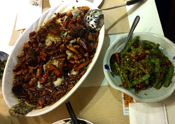 過去に食べた日本の四川料理より遥かに辛かった。 というか、唐辛子だけでなく、大量の山椒で、舌がしびれまくりでした。 いつもは、ビールもいっぱい飲むので、辛さも半減していたのかもしれません。 私は、お茶を何杯も飲み、かつ、ご飯で辛さを薄めていたのですが、 一緒に食事した通訳さんは、お茶もご飯も食べずに、「あまり辛くない」 と言ってました。